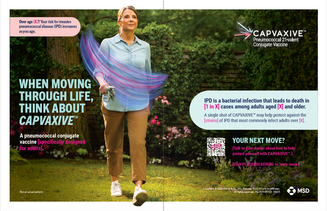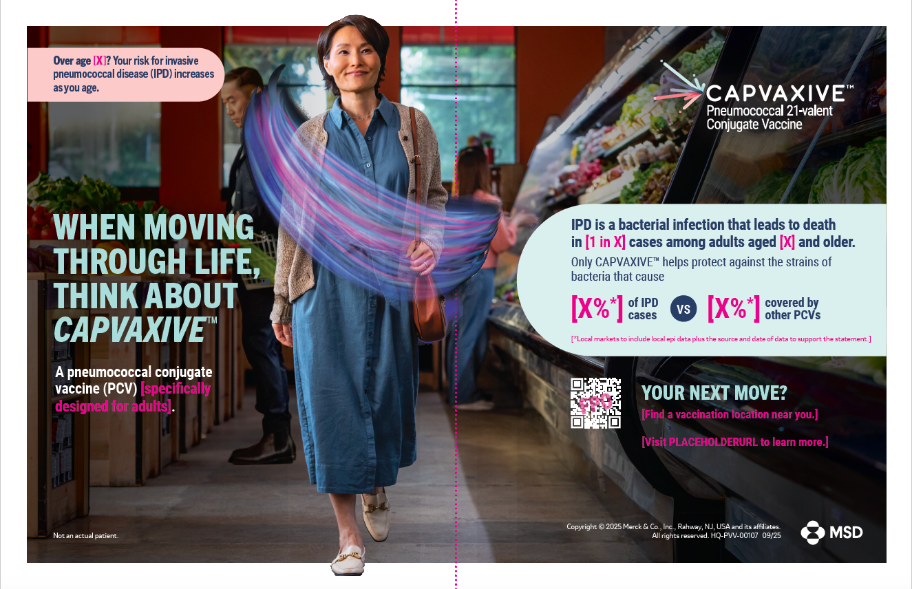 This attention-getting two-page spread features bold campaign imagery and concise messaging to quickly educate consumers on the risk of adult IPD and the need for protection as they move through life.