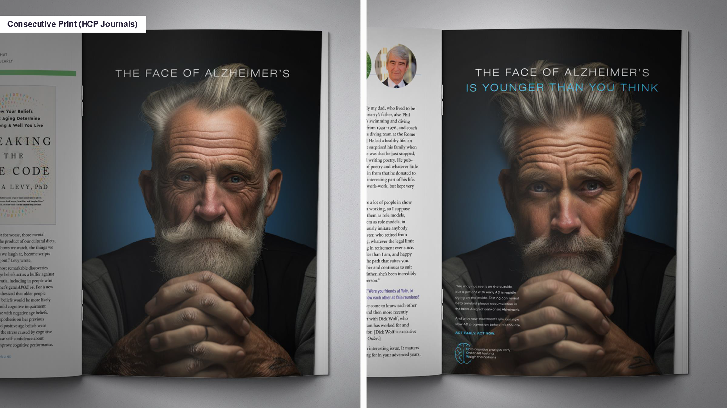 A sequential two-page ad: the first sets the expectation, the second delivers the wake-up call.